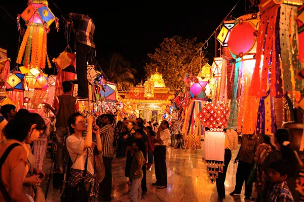 From temples to schools, people gather in large numbers to craft colorful lanterns that illuminate the evening. They are plain and classic as well as innovative, depicting temples, houses, or mythological events.